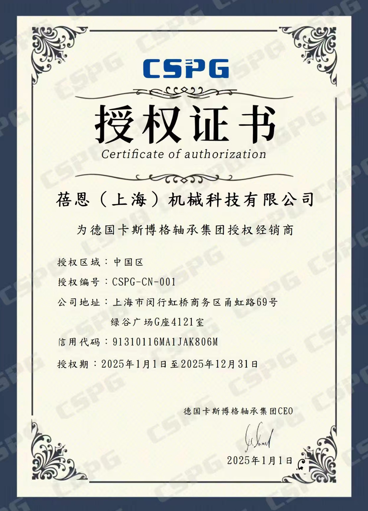 蓓恩機(jī)械2025年繼續(xù)獲得CSPG(精密主軸軸承/高速電主軸)授權(quán)
